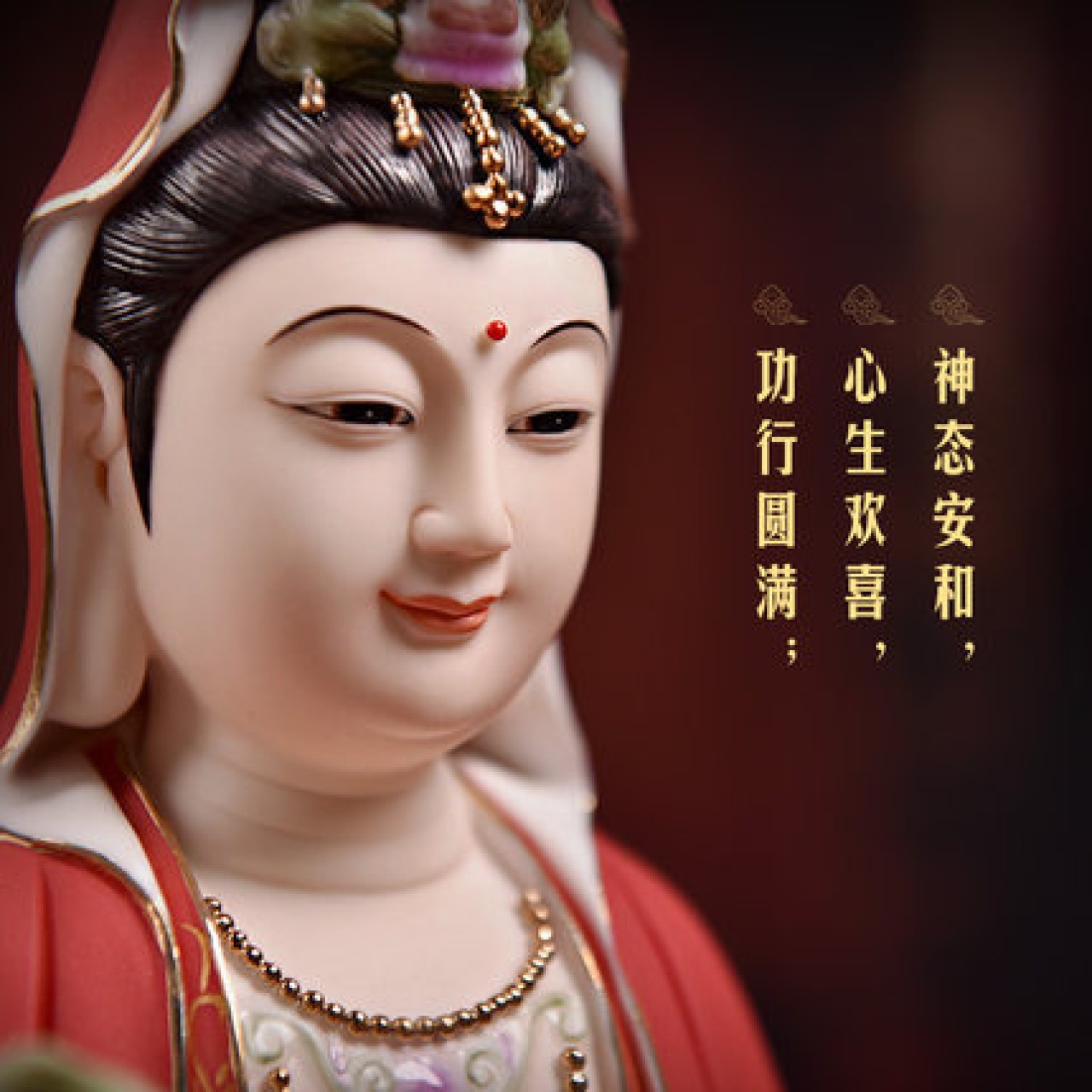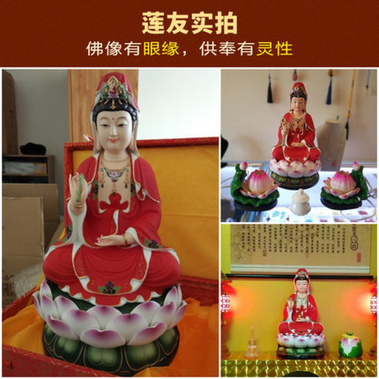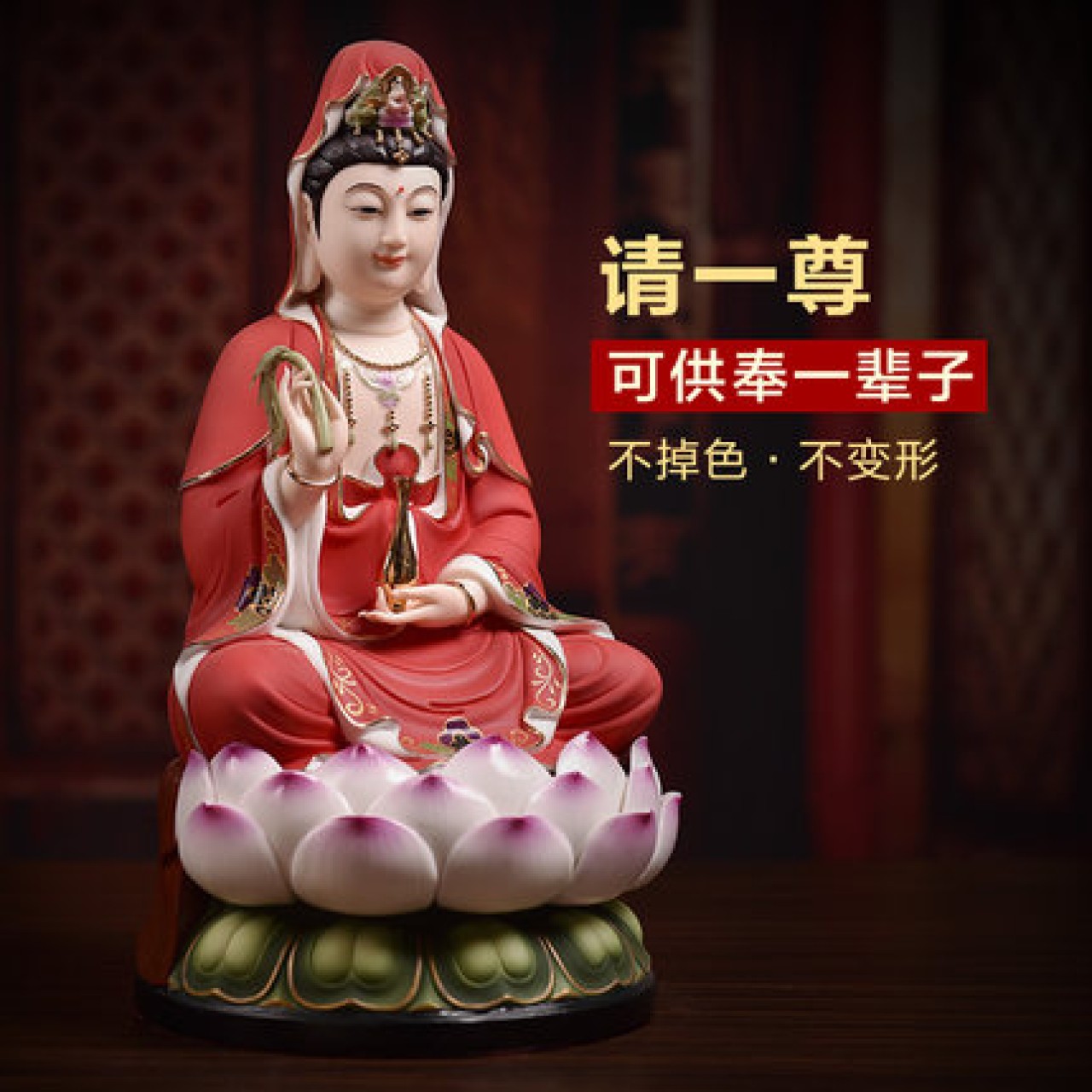 观音菩萨供奉佛像陶瓷摆件14吋描金边红衣彩坐莲观世音