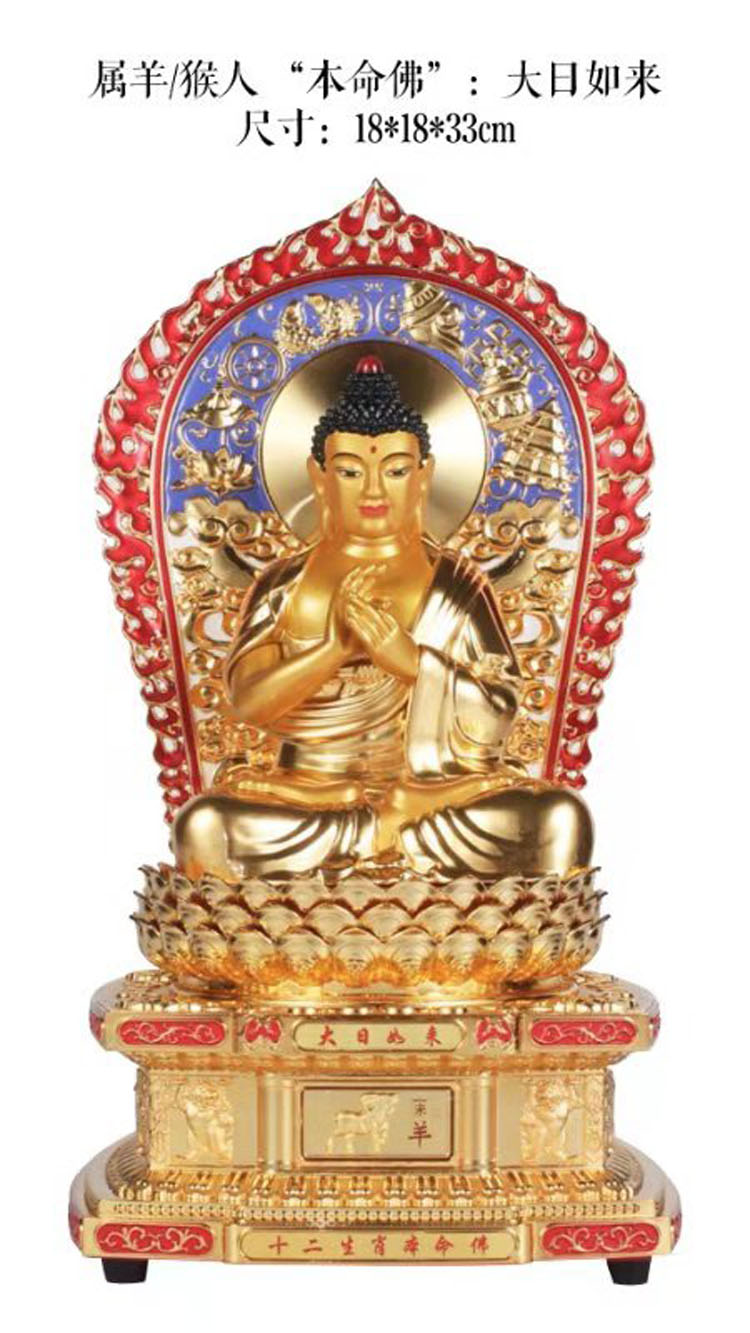 大日如来是遍照一切世间万物而无任何阻碍的法体,众德圆满。属羊、属猴人与大日如来感应力最强,羊年、猴年生人虔心供养大日如来之本命佛法像,可萌生佛心,获如来光明,成就一番宏图大业。
