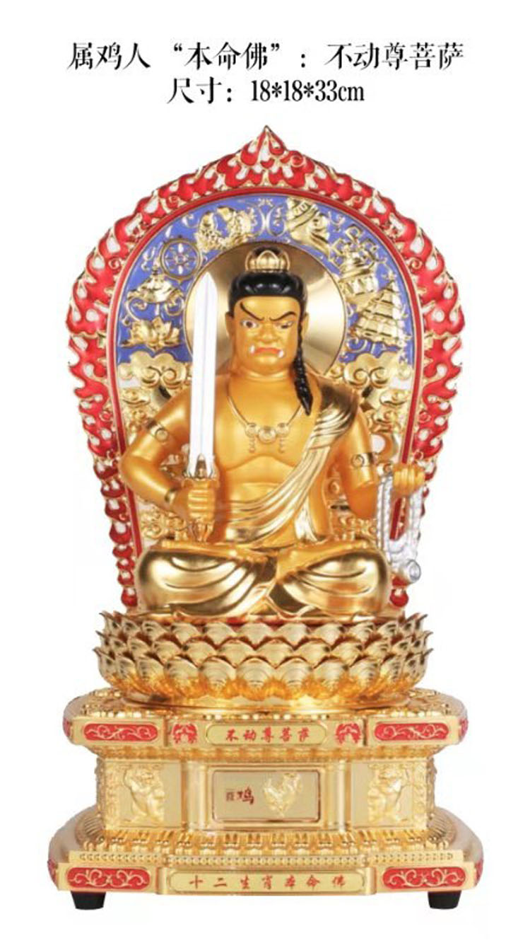 不动尊菩萨亦称不动明王,能扫除障难,不为动摇。属鸡人与不动尊菩萨感应力最强,属鸡人虔心供养不动尊菩萨之本命佛法像,可远离邪魔侵扰,事业有成,平安如意。