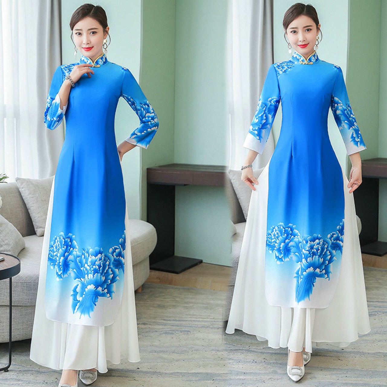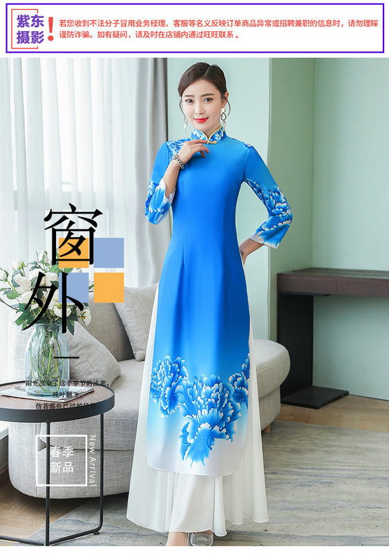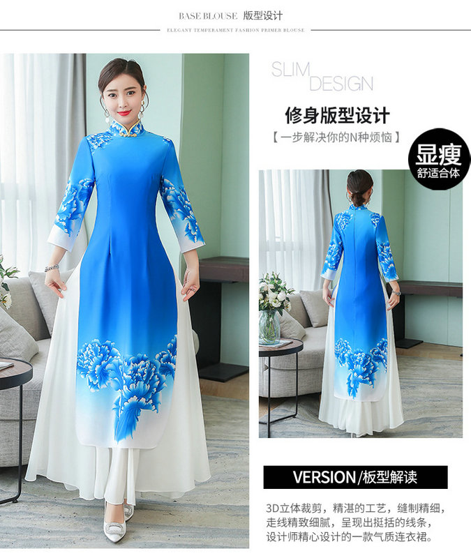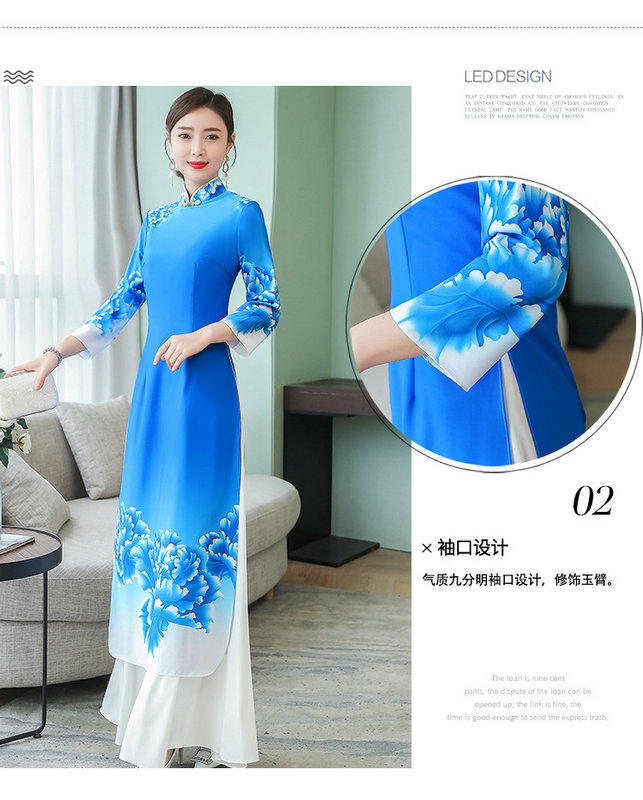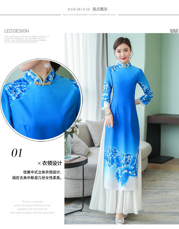 2019春夏新款中国风舞台演出旗袍服长款奥黛走秀旗袍七分袖连