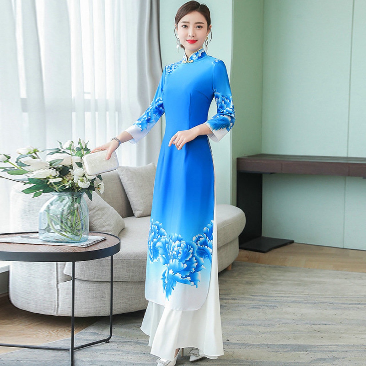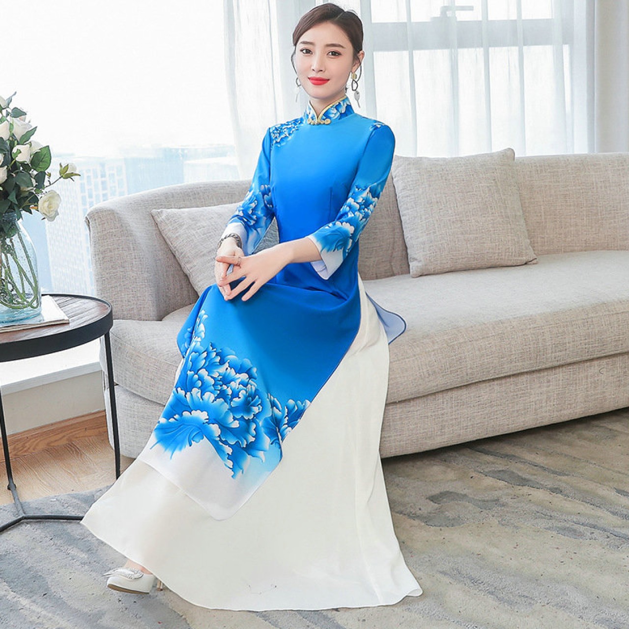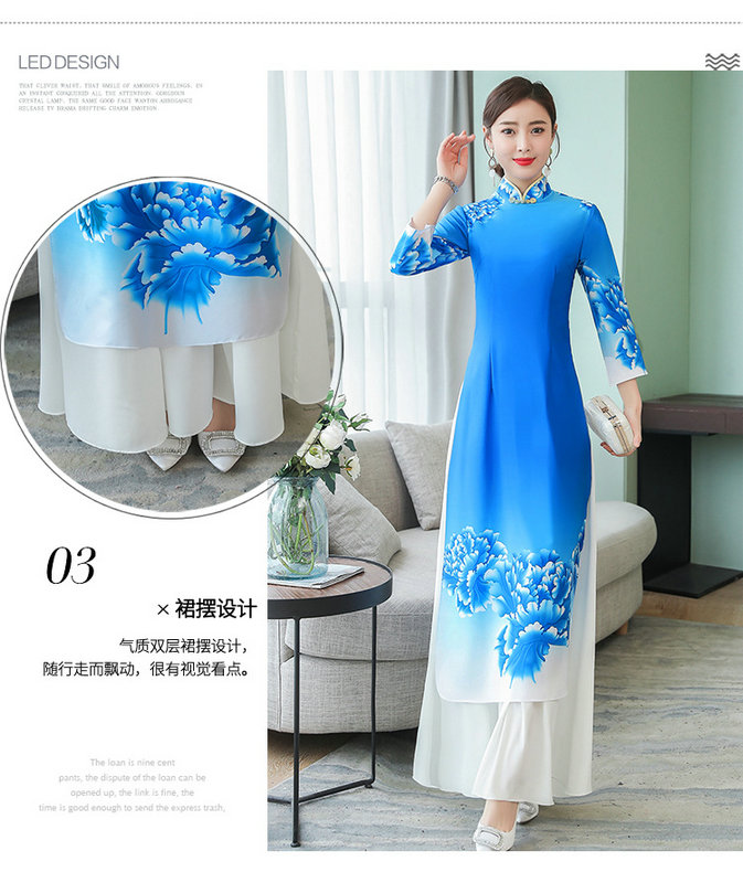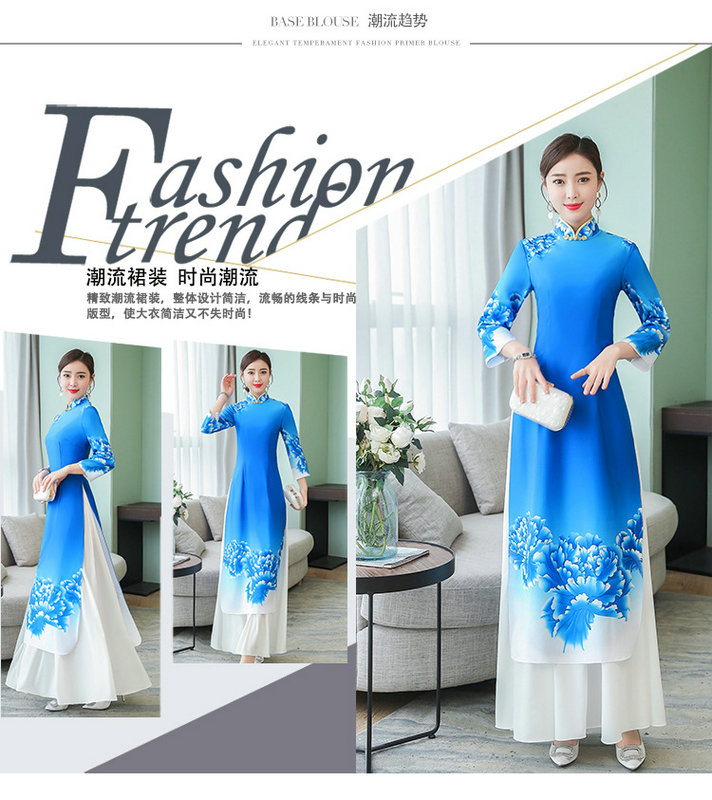 2019春夏新款中国风舞台演出旗袍服长款奥黛走秀旗袍七分袖连