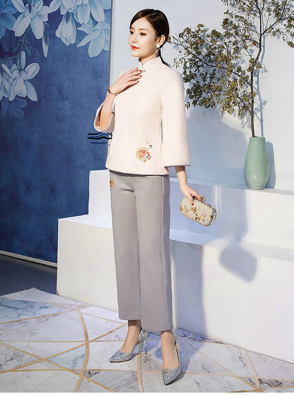 2019春季新款中国风复古毛呢中式汉服女旗袍套装裙茶服两件套