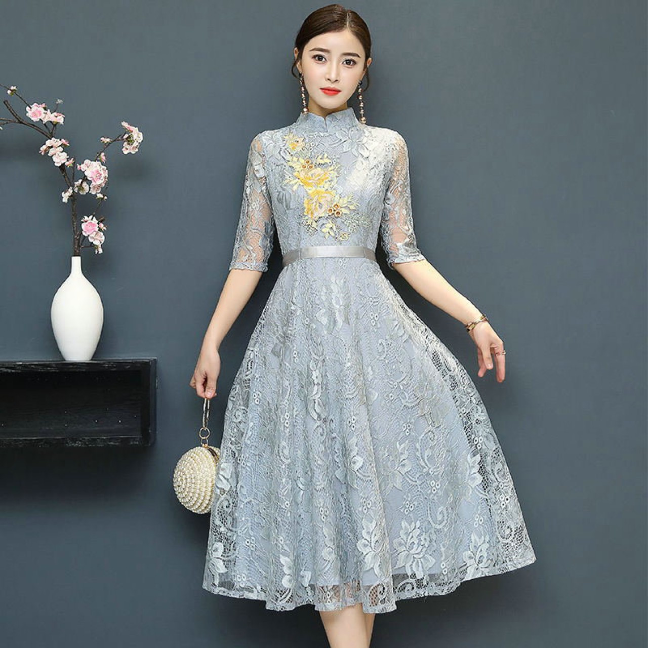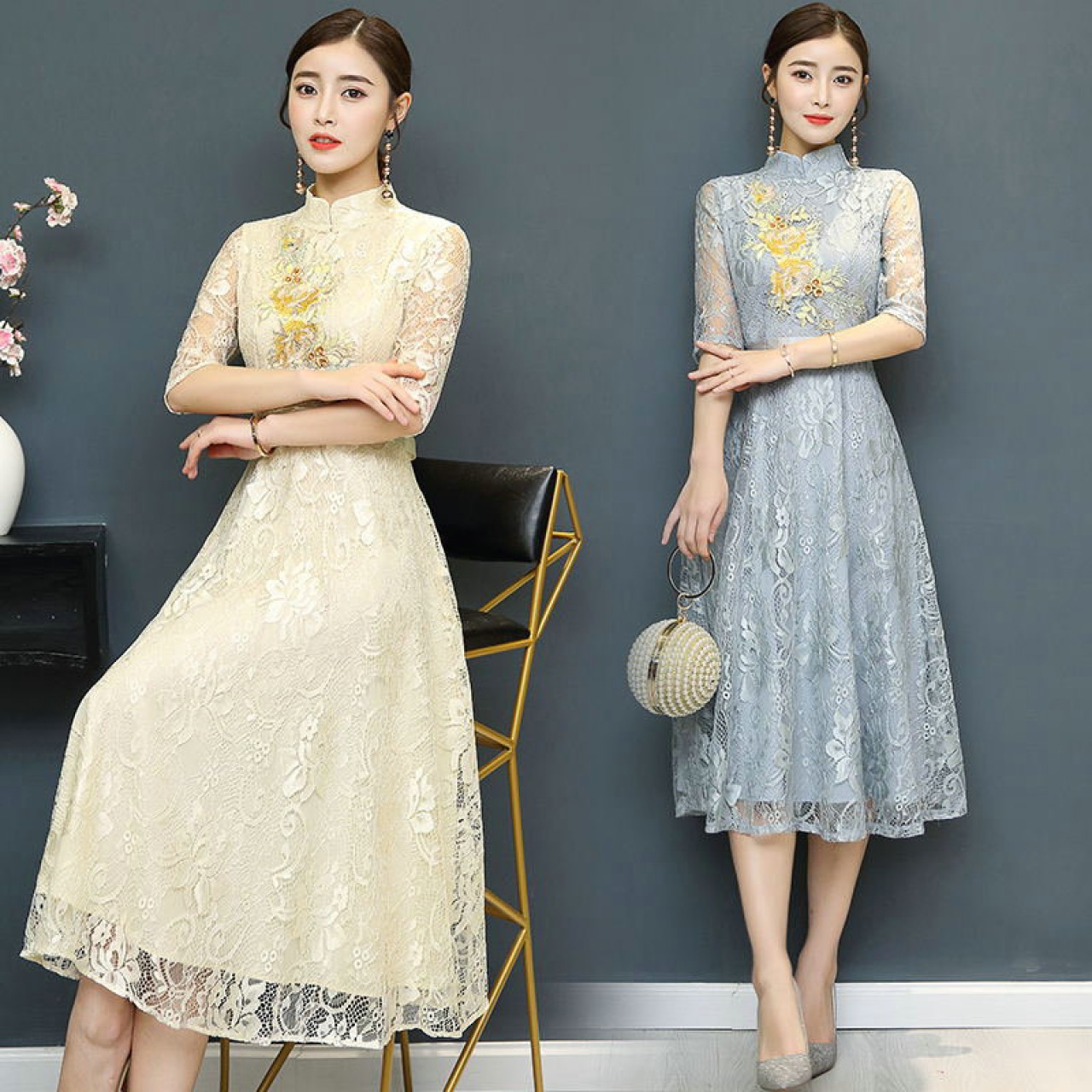 新款春季中式中袖礼服蕾丝旗袍 晚宴超大摆连衣裙