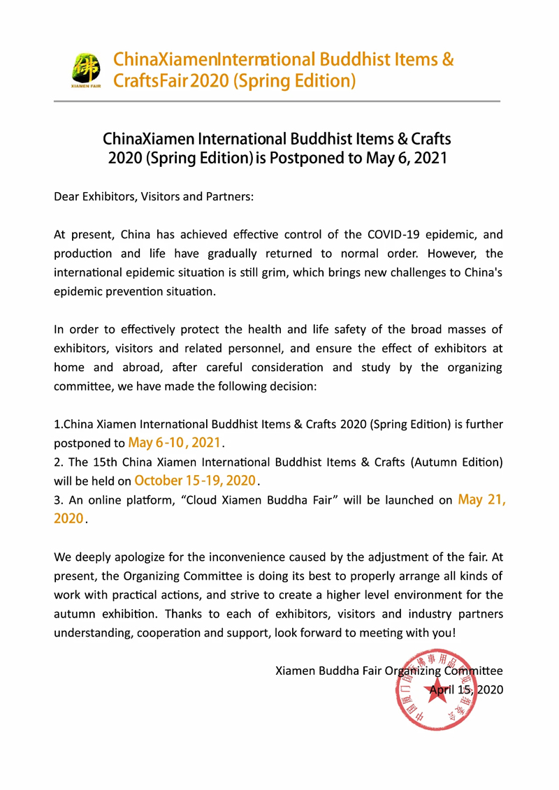 由于接到厦门佛事展官方通知:2020中国厦门国际佛事用品(春季)展延期至2021年5月,第十五届中国厦门国际佛事用品(秋季)展将于2020年10月15日-19日举办;具体详情请关注厦门佛事展官网:http://www.buddhafair.com/,谢谢!