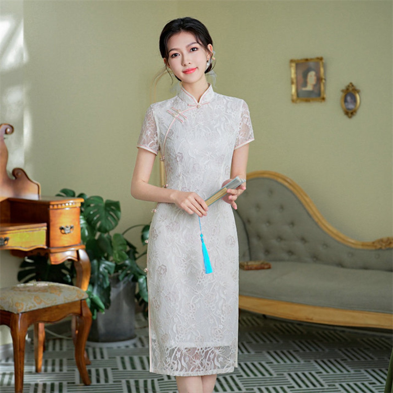 春夏新款复合蕾丝刺绣长款旗袍连衣裙日常改良少女年轻款旗袍